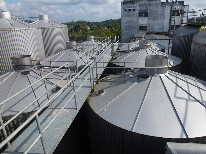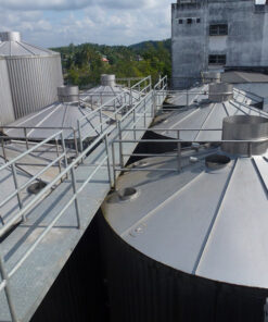 Lot de huit fermenteurs, construits par Gjettermann & Nielsen (Danemark). Chaque cuve offre une capacité brute de 1522 hl (capacité nette de 1350 hl) et est conçue pour opérer sous une pression de travail de 0,8 bar. Le contrôle de la température est assuré par deux zones de refroidissement utilisant l’ammoniac.