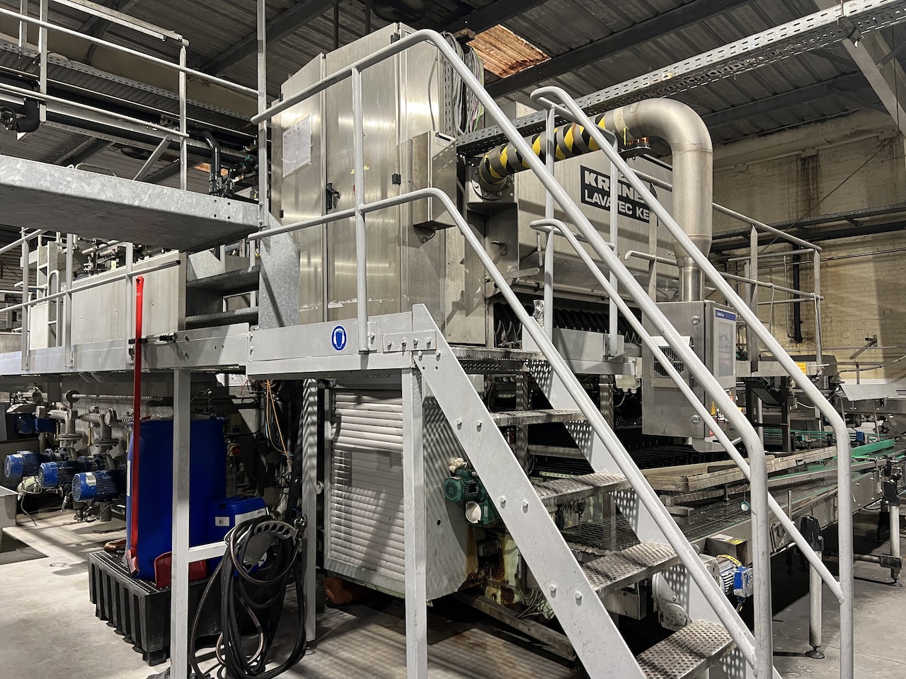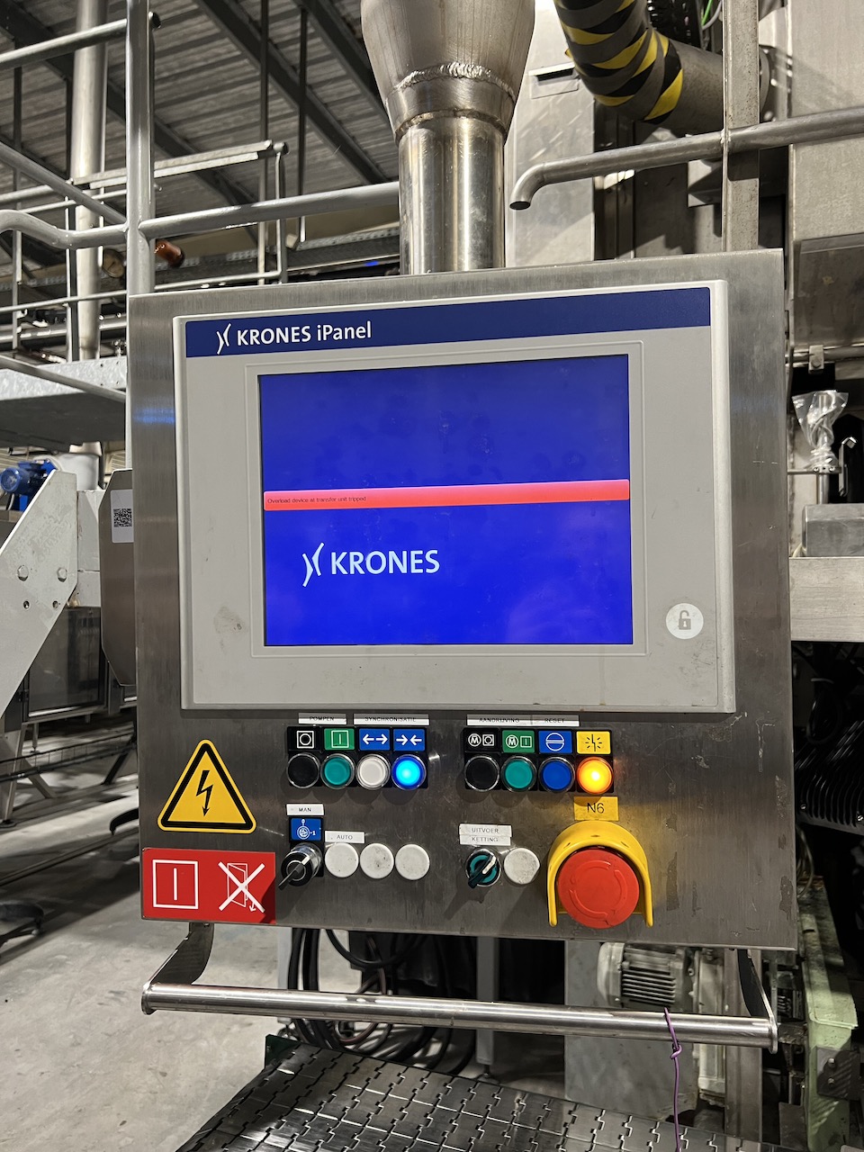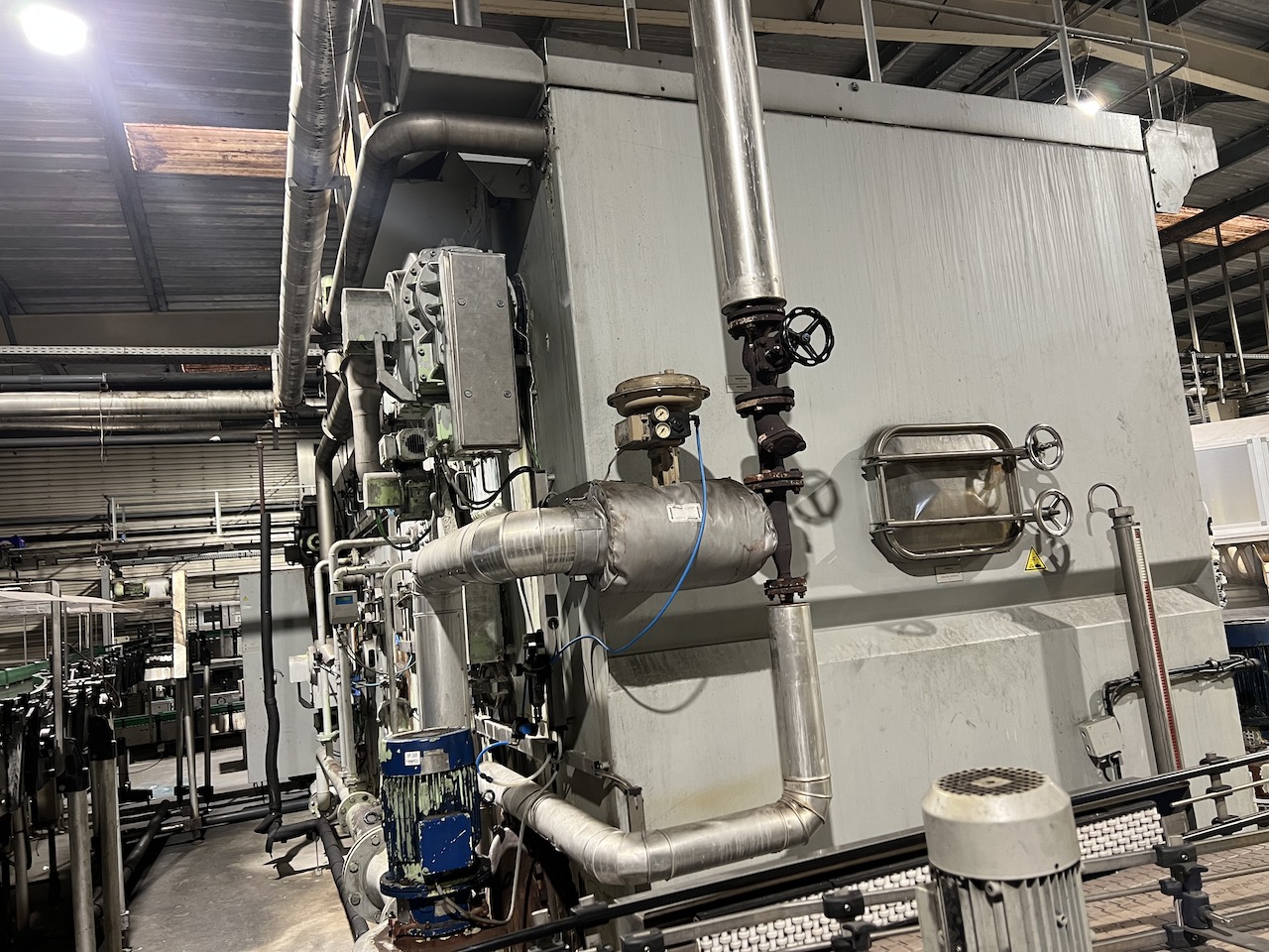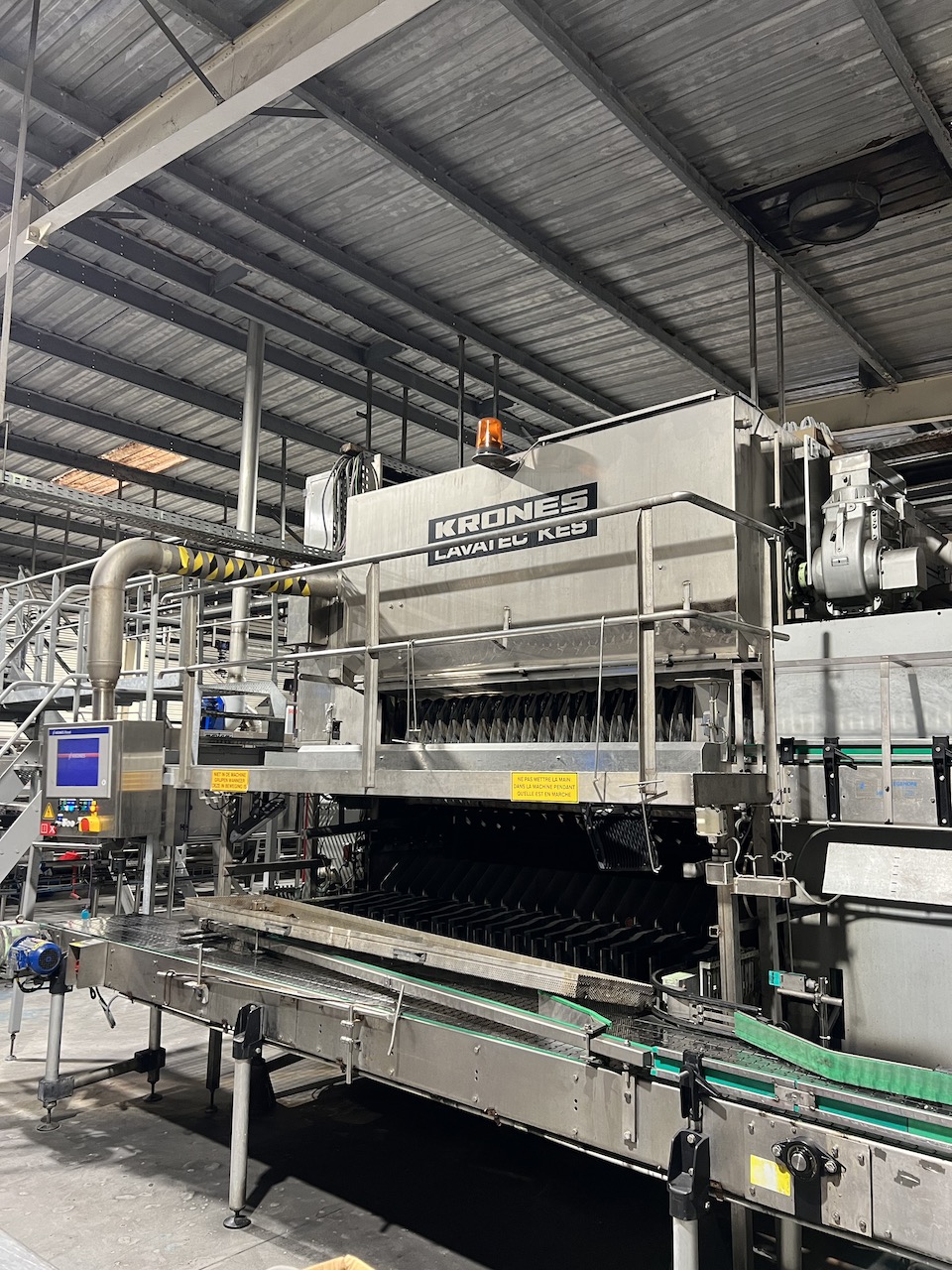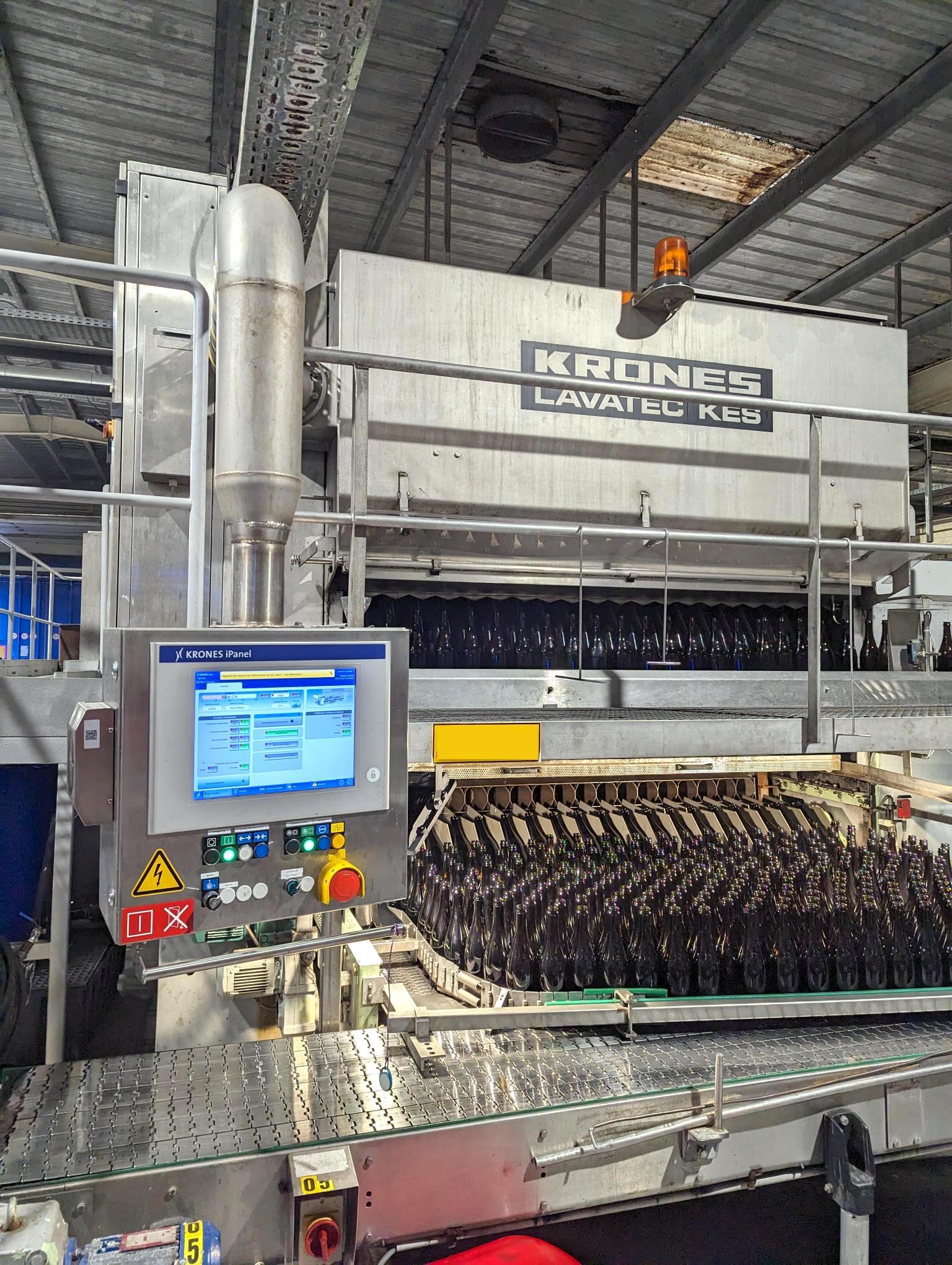 Laveuse de bouteilles KRONES Lavatec de 19 rangées. Sa polyvalence lui permet de traiter des formats allant de 18 cl à 75 cl. La machine a bénéficié d’une importante mise à jour en 2016, intégrant un nouvel écran tactile et un automatisme modernisé.